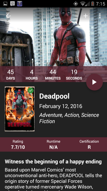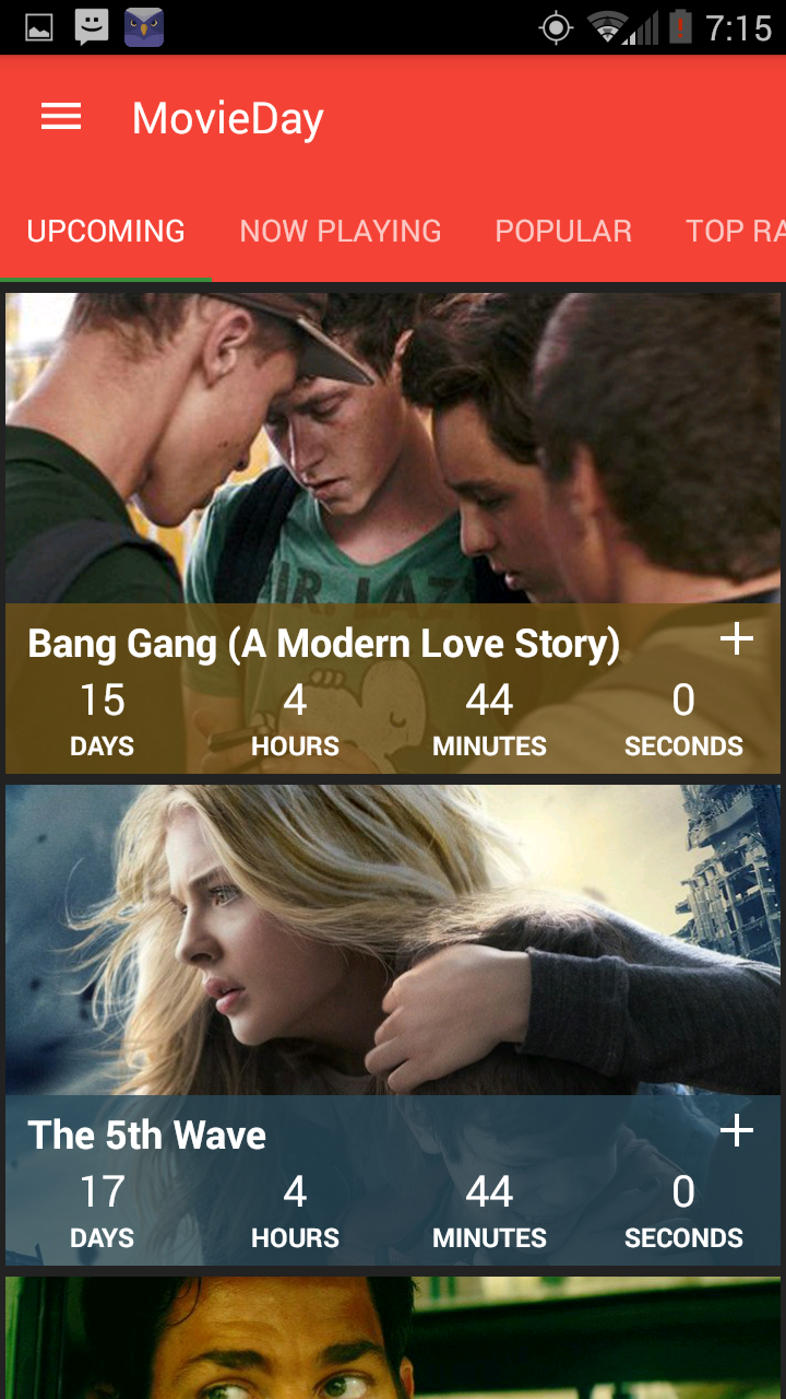 MovieDay has “Watched” and “Want To Watch” lists, so you keep the two separate. Its key feature is a countdown timer that is as specific as days, hours, minutes and even seconds till the movie’s first day. Plus what’s a countdown timer if it doesn’t notify you when a movie’s close to release? Well, MovieDay has got you covered; it notifies you of movies opening current week and when the countdown timer for a movie reaches zero. Each movie has its own set of colors, plot synopsis and more.